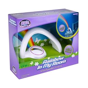 Rainbow In My Room, amazing rainbow projector. Project a beautiful rainbow across your walls and ceiling! Includes bonus window prism disk for real daytime rainbows! Turn your bedroom into a magical landscape with Rainbow In My Room. With a wave of your hand, a brilliant rainbow is projected across your walls and ceiling. It's a sure way to make any room a happier place! Features auto shut-off and jack for optional AC adapter (adapter not included). Requires 4 "AAA" batteries, not included.